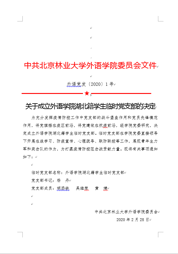 为充分发挥疫情防控工作中党员先锋模范作用,发挥组织优势,经外语学院党委研究,决定成立外语学院湖北籍学生临时党支部,支部书记由学院党委副书记担任。临时党支部在学院党委直接领导下开展在线学习、防疫宣传、心理疏导联防联控等工作,带领在鄂学生开展自我指导自我管理自我服务,为打赢疫情防控阻击战贡献力量。