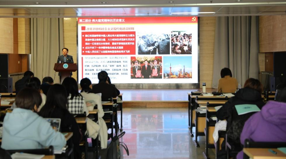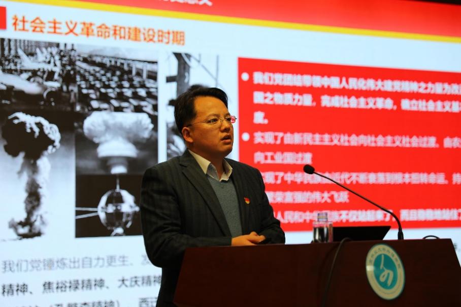 根据学校党委《关于认真学习贯彻习近平总书记在庆祝中国共产党成立 100 周年大会上的重要讲话精神的通知》中“在全校范围兴起学习研究宣传习近平总书记‘七一’重要讲话精神的高潮”的工作要求,和学校党委《关于成立学习贯彻习近平总书记“七一”重要讲话精神宣讲团工作方案》开展宣讲工作的部署,在学院党委理论学习中心组专题研学、学院各党支部深入学习研讨的基础上,学院党委书记雷韶华于11月19日向全院教职工讲解“伟大建党精神的深刻内涵和时代价值——学习贯彻习近平总书记‘七一’重要讲话精神”专题党课。学校党史学习教育指导组成员、实验室与设备管理处处长杨雪松莅临指导。外语学院党委副书记、院长李芝主持大会。
