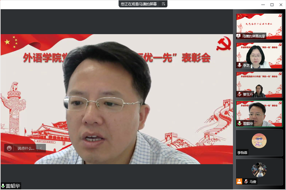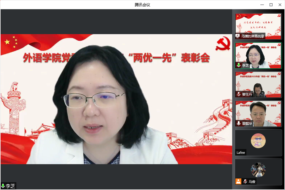 为庆祝中国共产党成立101周年,迎接党的二十大胜利召开,激励全院党员和教职工坚守为党育人、为国育才的初心使命,砥砺奋进新时代、新征程,624日,外语学院通过腾讯会议召开在线“两优一先”表彰会,对过去一年来学院涌现出的优秀共产党员、优秀党务工作者和先进党组织进行隆重表彰。外语学院党委书记雷韶华发表讲话,外语学院党委副书记、院长李芝宣读表彰决定,外语学院党委副书记、副院长姜玉丹主持会议。