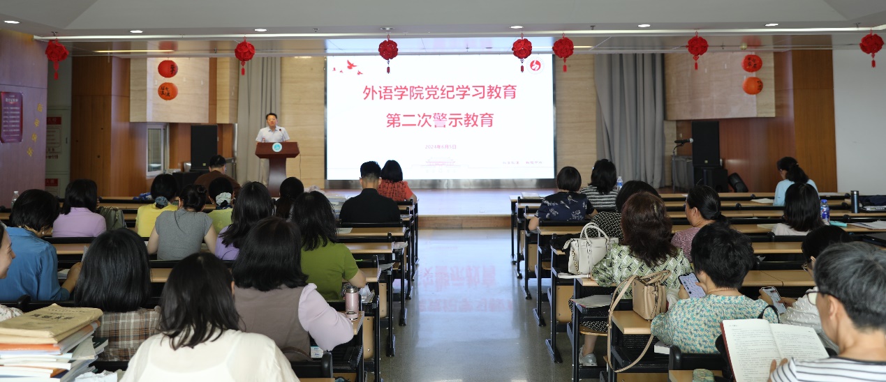 据悉,在6月5日召开的全院大会上,外语学院开展了党纪学习教育第二次警示教育,通报违反工作纪律、群众纪律、生活纪律和师德师风相关规定的典型案例。宣布了党纪学习教育“学纪、知纪、明纪、守纪”党纪知识竞答比赛活动获奖师生名单,并将在学院“七一”表彰大会上予以表彰。此前,在5月15日的全院大会上,外语学院开展了党纪学习教育第一次警示教育,通报违反政治纪律、组织纪律、廉洁纪律和中央八项规定精神的典型案例。