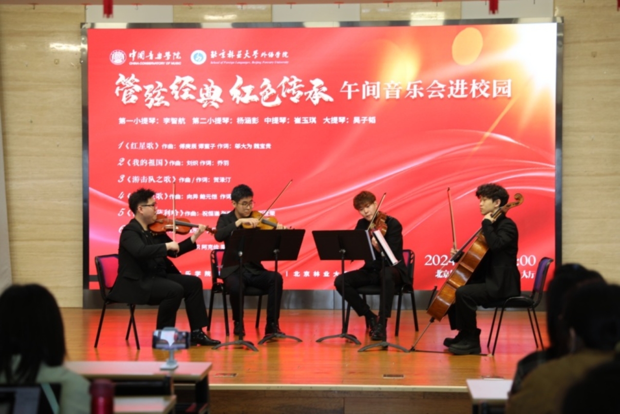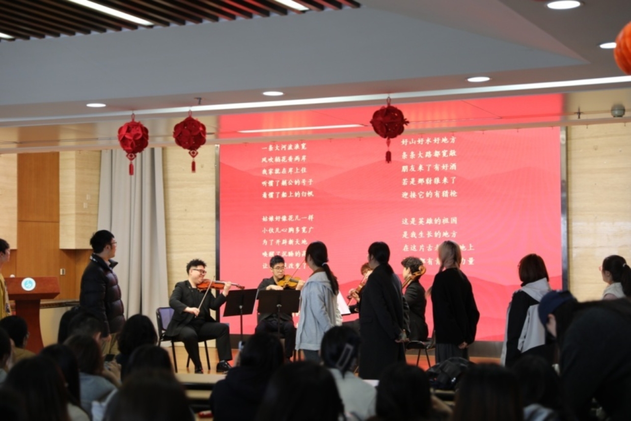 为了加强对学院师生的红色革命文化教育,增强学院师生坚定不移跟党走的信念,近日,外语学院携手中国音乐学院管弦系举办午间音乐会,为师生呈现了一场高雅、精湛的红色弦乐盛宴。外语学院党委书记雷韶华,党委副书记、院长李芝,党委副书记、副院长姜玉丹,副院长冯强,中国音乐学院管弦、指挥系(直属)党支部副书记江春和系办公室钟渴欣老师出席。