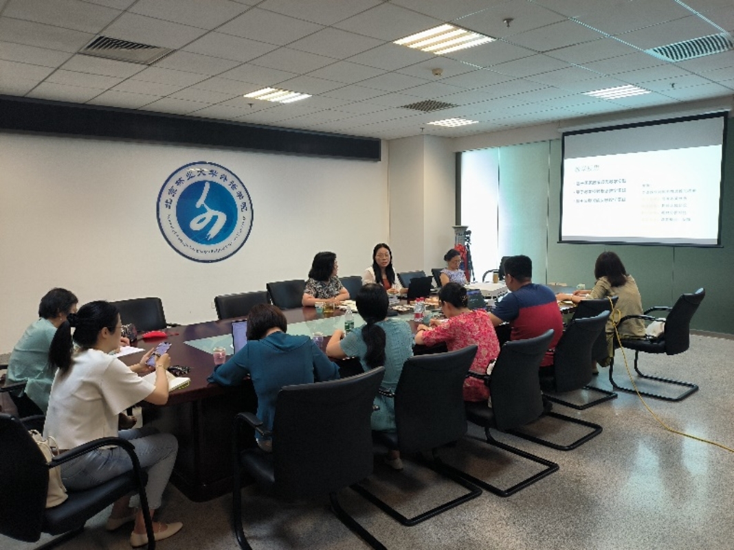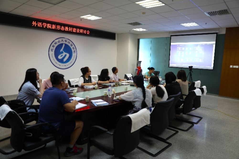 在新形态教材建设研讨会上,北京全球语通教育科技有限公司市场总监张欣欣,蓝鸽集团相关负责人和研发人员,院长李芝,副院长冯强、吴增欣,以及参与教材编写工作的英语教师代表,围绕提升学院教师的数字化素养、推进外语教材的数字化转型,深入探讨了人工智能技术在编写校本特色教材中的应用。