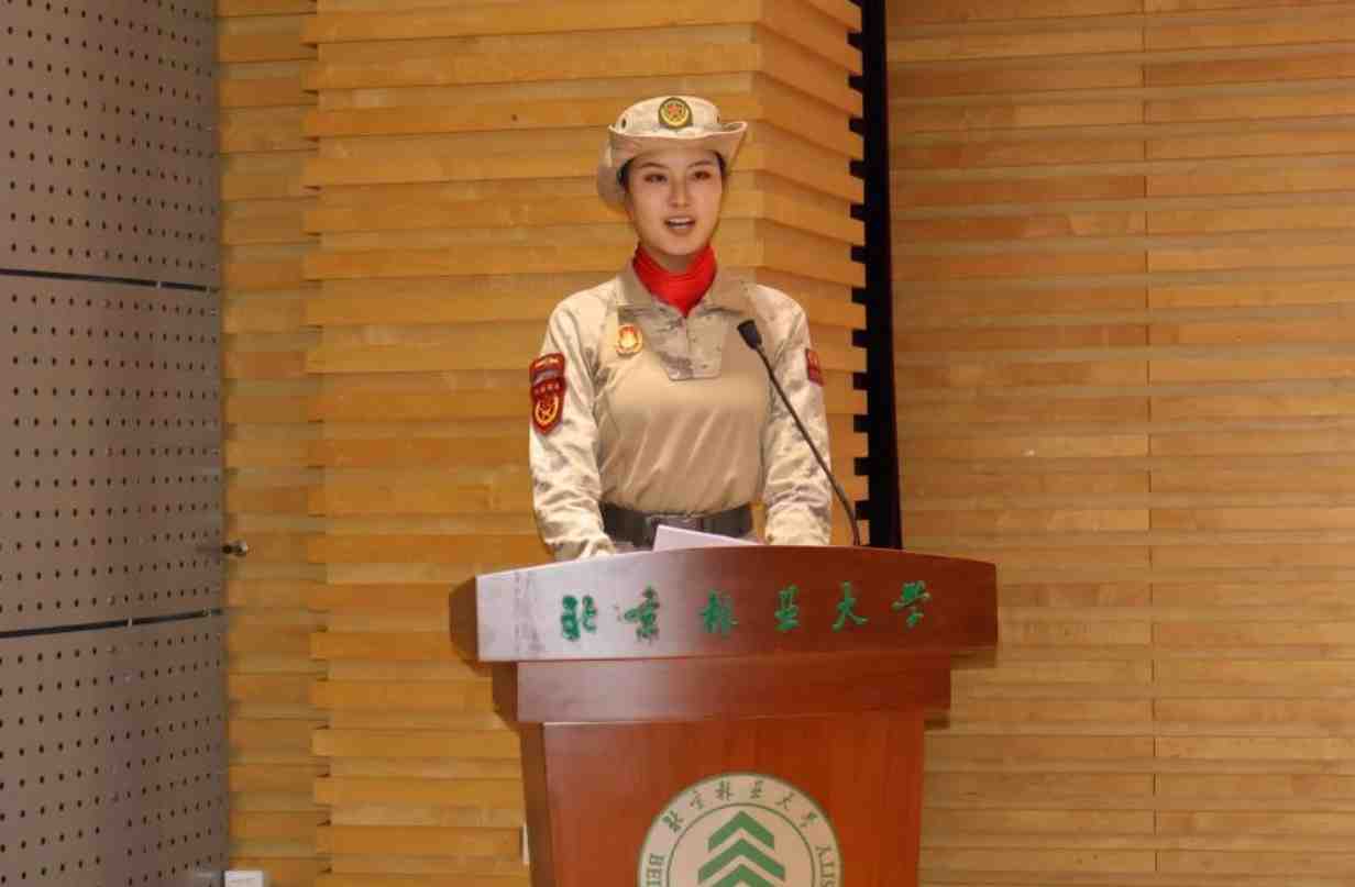 万紫怡在大会上进行分享。她讲述了自己作为民兵方队第一排面队员受阅的事迹与感悟,回顾了在学校和参军入伍期间的经历,号召新生们练就过硬本领、涵养家国情怀,主动扛起国家发展的责任。