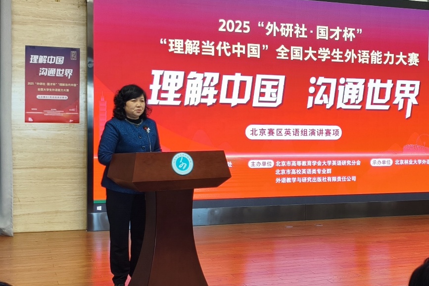 11月1日,2025“外研社·国才杯”“理解当代中国”全国大学生外语能力大赛北京赛区英语组演讲比赛在北京林业大学举行。北京林业大学党委常委、副校长张志强,北京市教育委员会高等教育处处长李惊涛,北京市高等教育学会大学英语研究分会理事长、北京大学外国语学院党委书记李淑静,外语教学与研究出版社高等营销中心华北大区总经理赵静,北京林业大学教务处处长徐迎寿出席活动。北京林业大学外语学院院长李芝主持大赛开幕式。