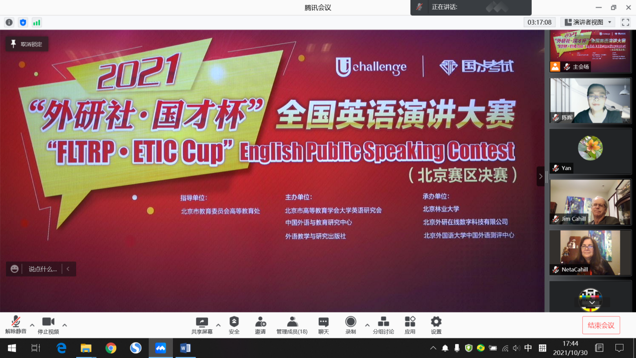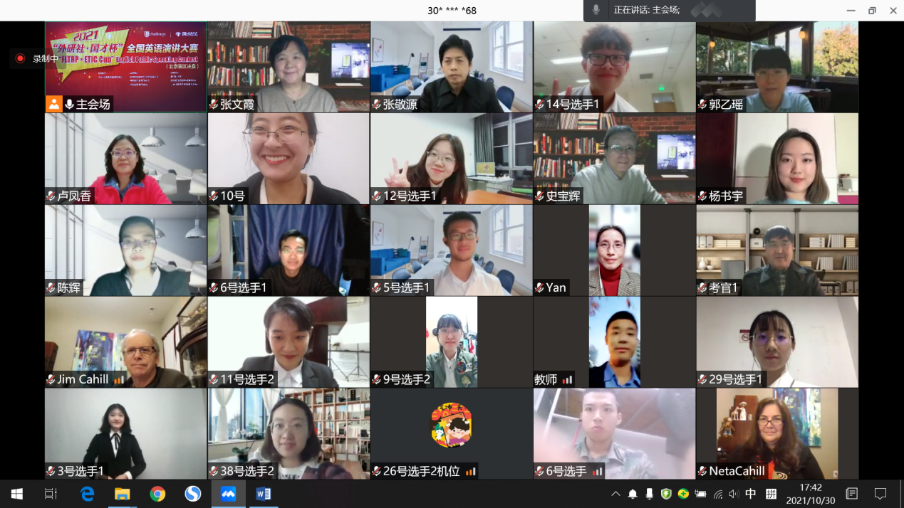 10月30日,2021年“外研社·国才杯”全国英语演讲大赛北京赛区复赛在北京林业大学举办。受疫情影响,本次大赛采取线上方式进行。大赛由外语教学与研究出版社、北京外研在线数字科技有限公司、中国外语测评中心主办,教育部高等学校大学外语教学指导委员会、教育部高等学校英语专业教学指导分委员会、中国外语与教育研究中心、北京市高教学会大学英语研究会合办,北京林业大学外语学院承办。