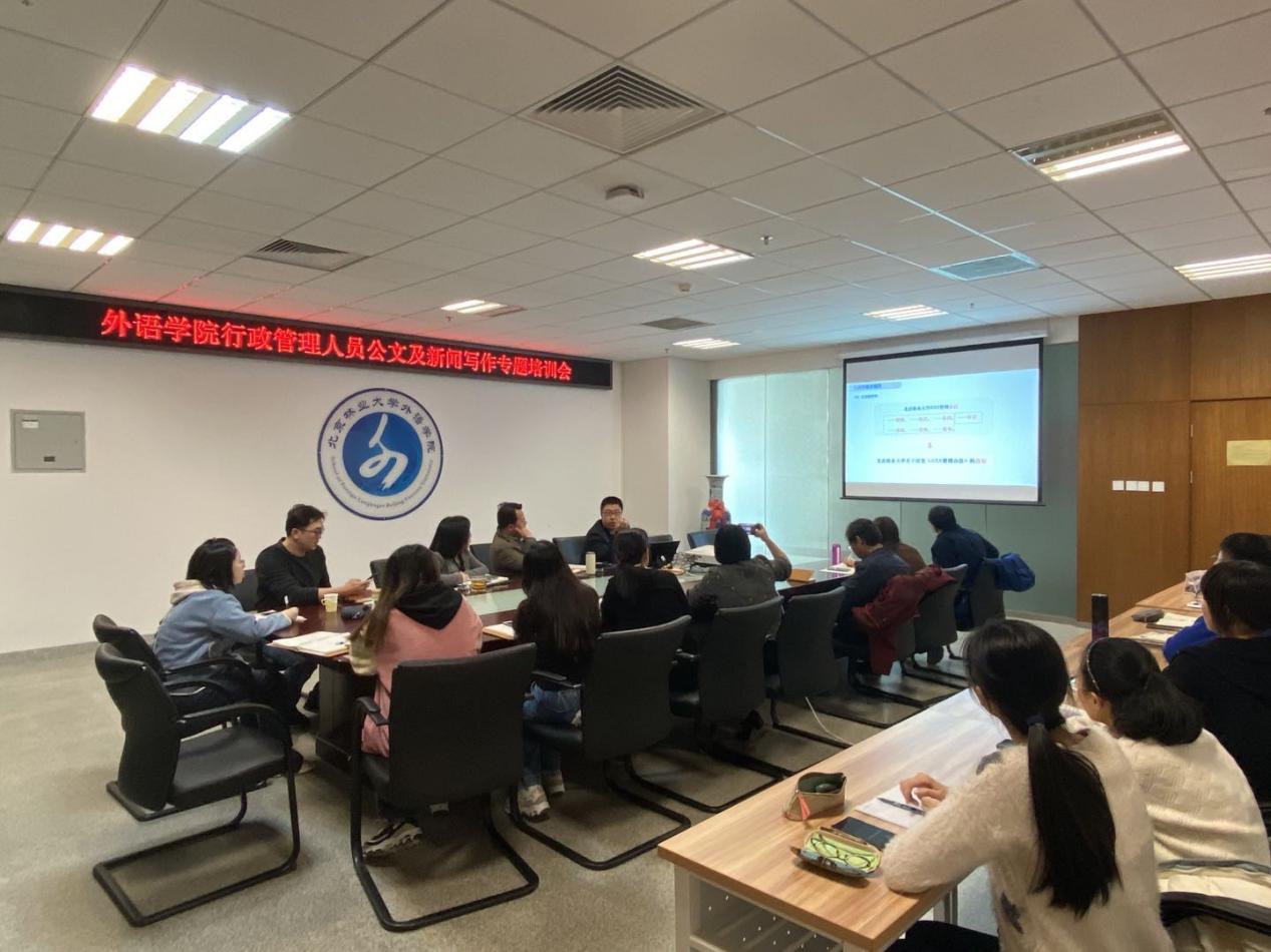 10月20日下午,外语学院邀请党委宣传部副部长杨金融在学研中心9层会议室为行政管理人员及学生骨干开展公文及新闻写作专题培训。学院党委书记雷韶华,党委副书记、院长李芝,党委副书记、副院长姜玉丹,副院长马俊,以及全体行政管理人员、学生骨干参加培训。