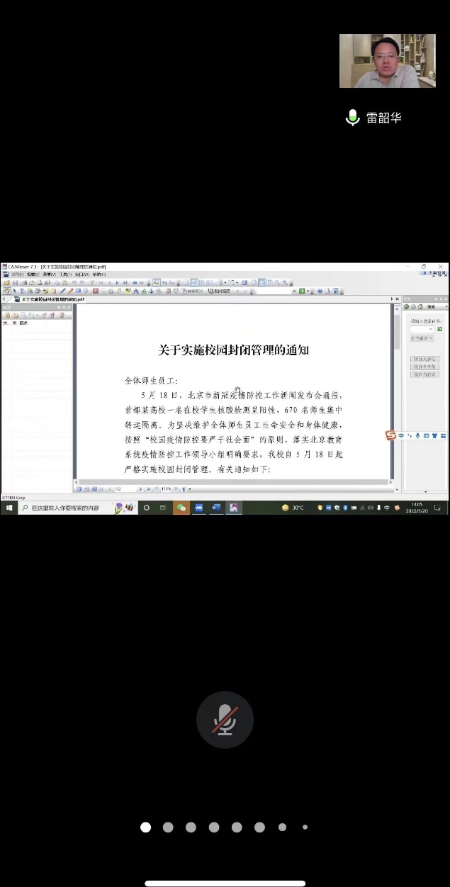 雷韶华向全院教职工详尽传达了5月18、19日学校连续两天召开疫情防控工作会议的精神和《关于实施校园封闭管理的通知》精神。他表示,北京某高校分校区出现阳性病例后,根据北京市委、市政府“校园疫情防控要严于社会面”的工作原则和高校实施封闭管理的统一部署,学校经过综合考量、慎重研究,实施了校园封闭管理措施,体现了对师生生命健康安全的高度重视,希望全院教职工充分理解、大力支持,封闭管理措施会根据北京疫情发展及时调整,尽快回归正常。他强调,全院教职工要提高站位,树立大局意识和全校“一盘棋”的思想,充分认识校园封闭管理的必要性,严格落实学校各项防控工作要求,做好自身和家人健康防护,加强自身和家人健康监测,按时参加核酸检测,身体出现异常情况要第一时间上报。他要求,全院教职工要按照学校统一部署,做好线上教学、期末考试、毕业答辩以及期中教学检查等方面的工作。辅导员、班主任、研究生导师要加强与学生的交流沟通,密切关心关注校园封闭管理状态下学生的心理和情绪变化,强化对学生的情绪疏解,发现苗头性问题要及时上报学院。