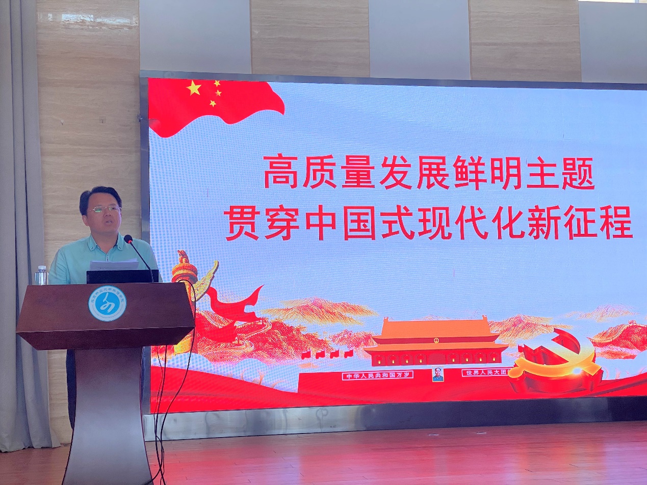 根据主题教育关于领导班子成员讲解专题党课的工作要求,5月11日,院党委书记雷韶华向全院教职工讲解《高质量发展鲜明主题贯穿中国式现代化新征程》专题党课。教师工作部副部长刘伟莅临监督指导。