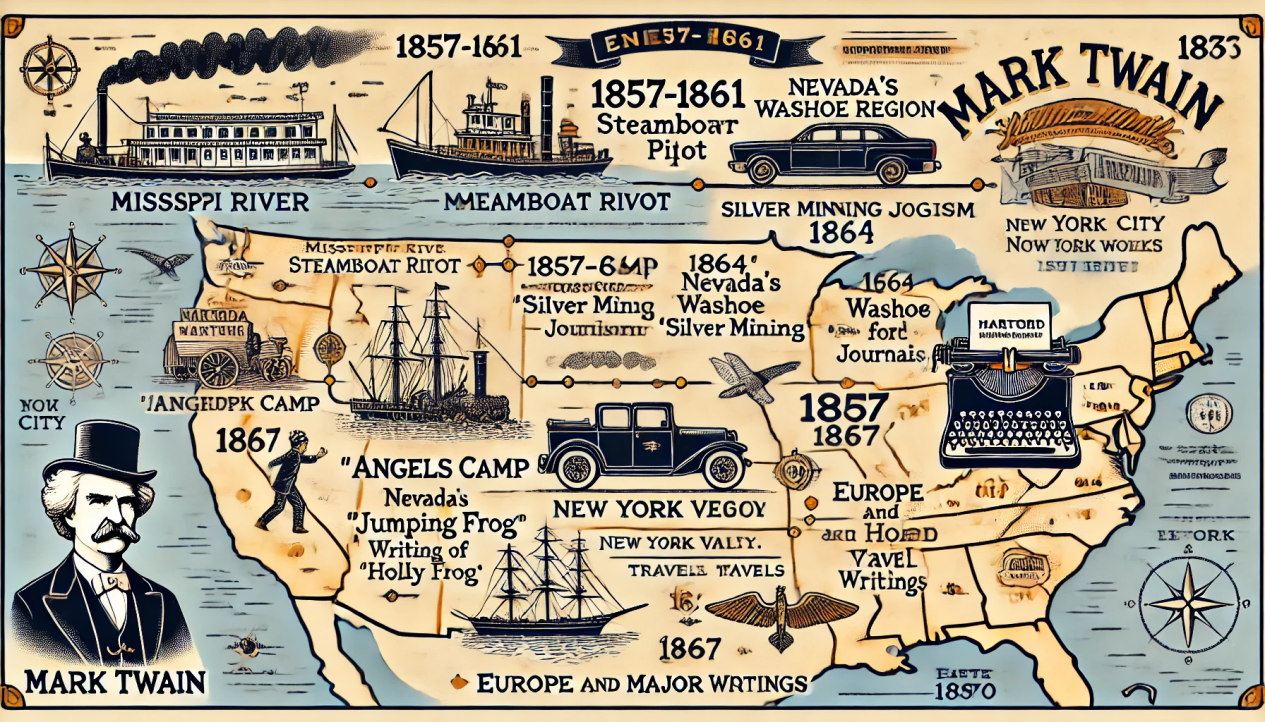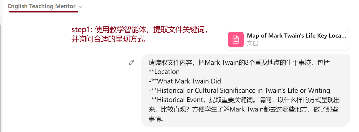 案例1:如何使用AI总结“Mark Twain”课文中Mark Twain去过的所有重要地点,以及发生的重要事件,并以图片形式展现出来,让学生直观了解Mark Twain的生平事迹?