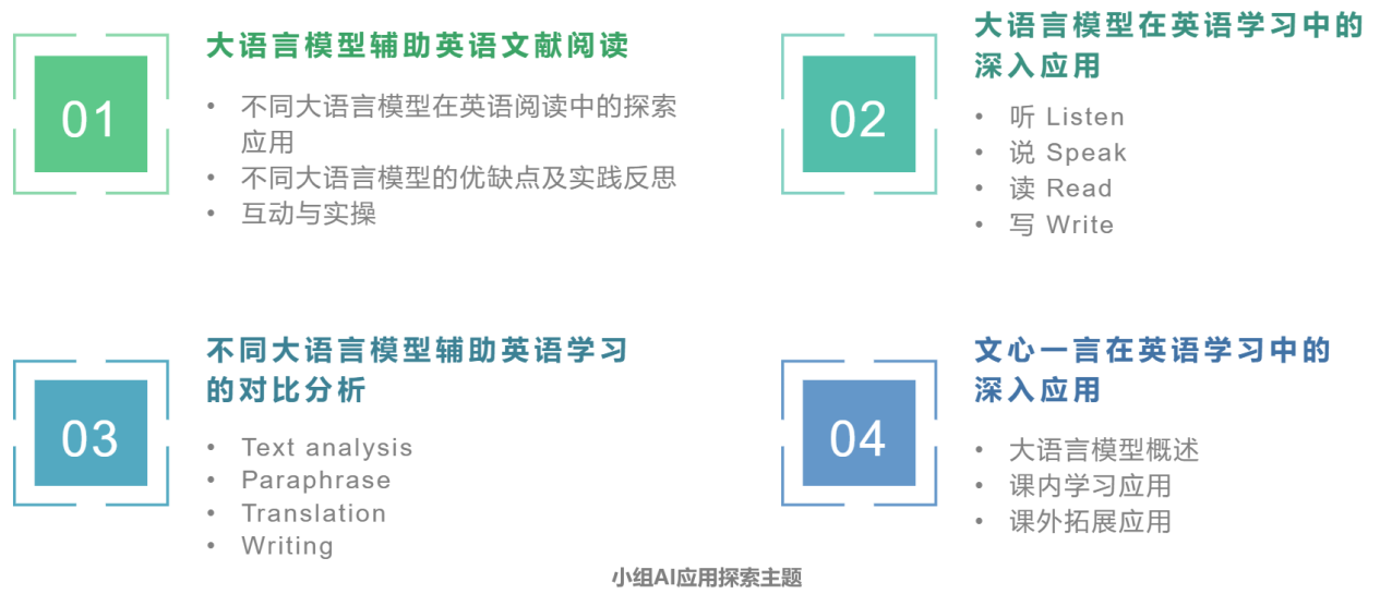 各小组以“不同AI的文献处理能力差异(如ChatGPT vs 文心一言)”、“探索AI在英语学习全流程中的应用”等题目进行汇报和讨论。