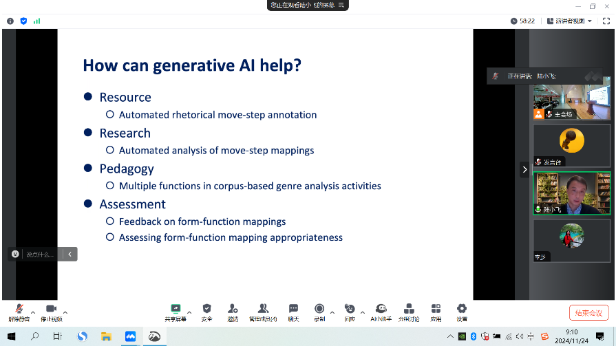 在主旨报告环节,美国宾夕法尼亚州立大学教授LUXiaofei作了题为“人工智能时代学术话语中形式-功能映射研究的未来方向探讨”的报告。他指出,基于语料库的写作研究揭示了一系列能够显著预测写作质量的语言形式特征,并阐述了语言形式特征、功能特征、“功能—形式”映射与写作质量之间的关系。他展示了人工智能技术在语料库建设和资源标注上的应用,强调了“功能—形式”映射在写作质量评价中的必要性,讨论了该映射分析在学术话语教学与测试中的应用前景。
