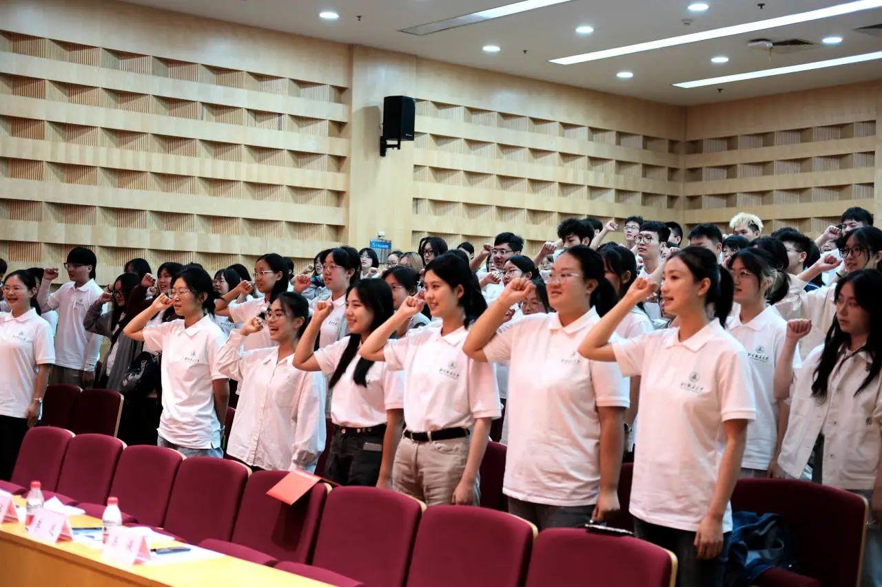 9月10日,在学院召开的2024年“绿色起航,语梦同行”迎新大会上,雷韶华带领全体新生齐声祝贺老师们节日快乐,并向在场老师们高声宣誓,未来将好好学习、天天向上,不辜负老师们的教诲和培养,争做新时代新征程勇于担当责任使命的奋进青年,以激发同学们的学习动力,增强同学们的感恩意识,培养同学们尊师重道的品质。