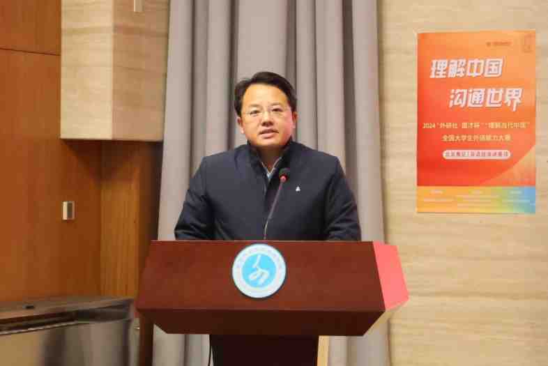 在开幕式上,外语学院党委书记雷韶华代表比赛承办方致辞。他对各位嘉宾、评委、选手的到来表示欢迎,对关心、支持、指导学院承办本次大赛的单位表示感谢。他介绍了我院深化“三进”工作,推动理解当代中国系列教材融入专业学科和公共外语教学的情况。他希望各位选手以赛促学,持续提升用外语讲好中国故事、传播好中国声音的能力水平。