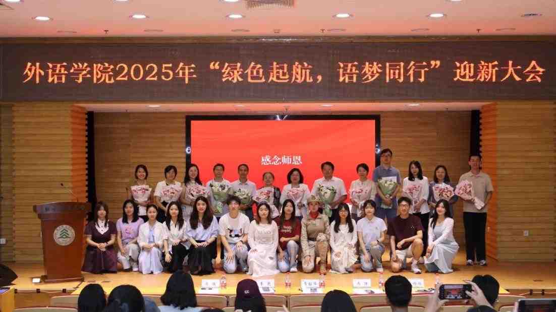 9月8日,在学院召开的2025年“绿色起航,语梦同行”迎新大会上,学院特别设置了“感念师恩”环节,播放学院专门录制的各班级同学对老师的祝福视频,并由14名同学和校友代表向老师们敬献鲜花,表达感恩和祝福之情。