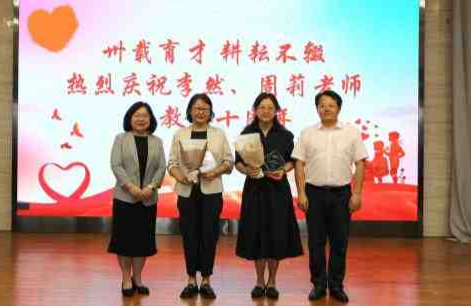 在9月10日的全院大会上,学院以“感念师恩”为主题,通过多项仪式致敬深耕教坛的老师们。在学院专门录制的《感念师恩》视频中,学生们用质朴的语言表达了对老师们的节日祝福。在从教满整十周年纪念活动中,学院党委书记雷韶华、院长李芝为从教满20周年、30周年的老师们颁发定制水晶纪念牌并献上鲜花。从教满20周年教师代表朱丽轩在致辞时表示,20年教育生涯与学院发展紧密交织,学院既是教师的成长见证者,更是引路人,学院全体教师将坚守教育初心,静待桃李芬芳。她坚信,在学院的引领与同仁的共同耕耘下,学院未来必将再创佳绩。