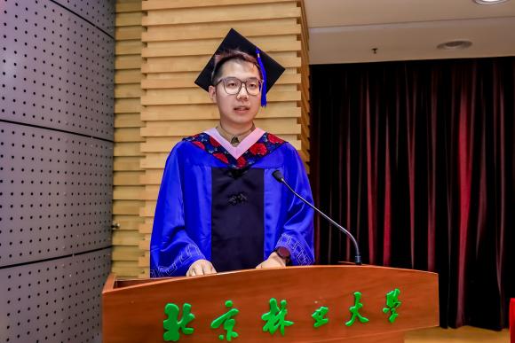 硕外21班徐启朔代表全体毕业生发言。他回顾了精彩而充实的校园生活,表示将用行动和奋斗书写新时代北林人的华彩篇章。