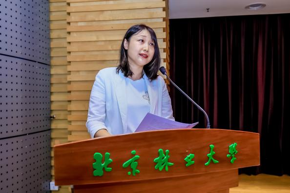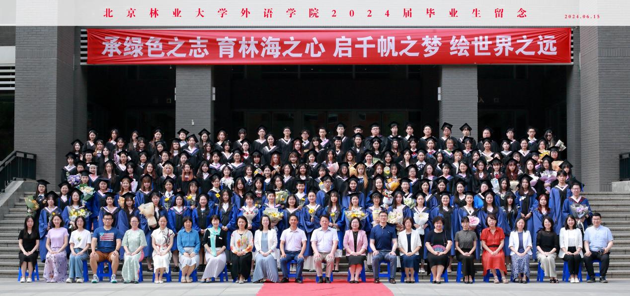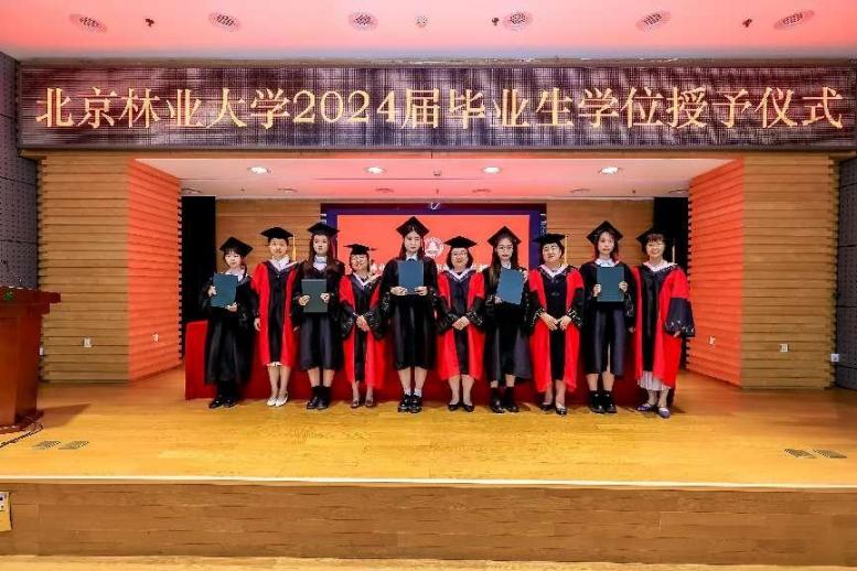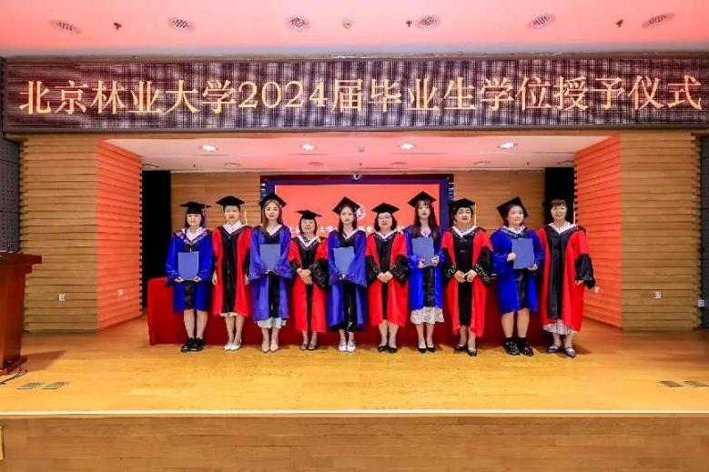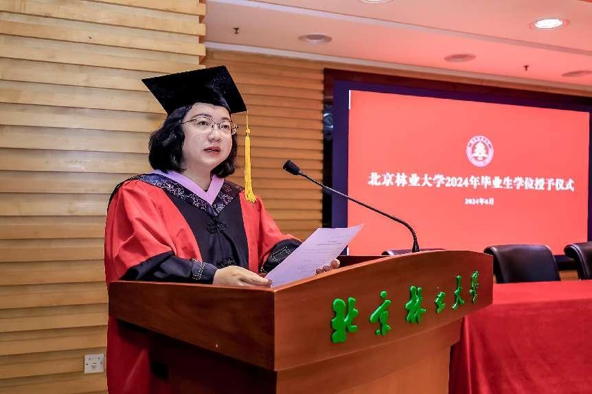 院学位评定委员会主任、院长李芝宣读《北京林业大学关于授予2024届毕业生学位的决定》。118名本科生被授予文学学士学位,9名研究生被授予文学硕士学位,38名研究生被授予翻译硕士学位。