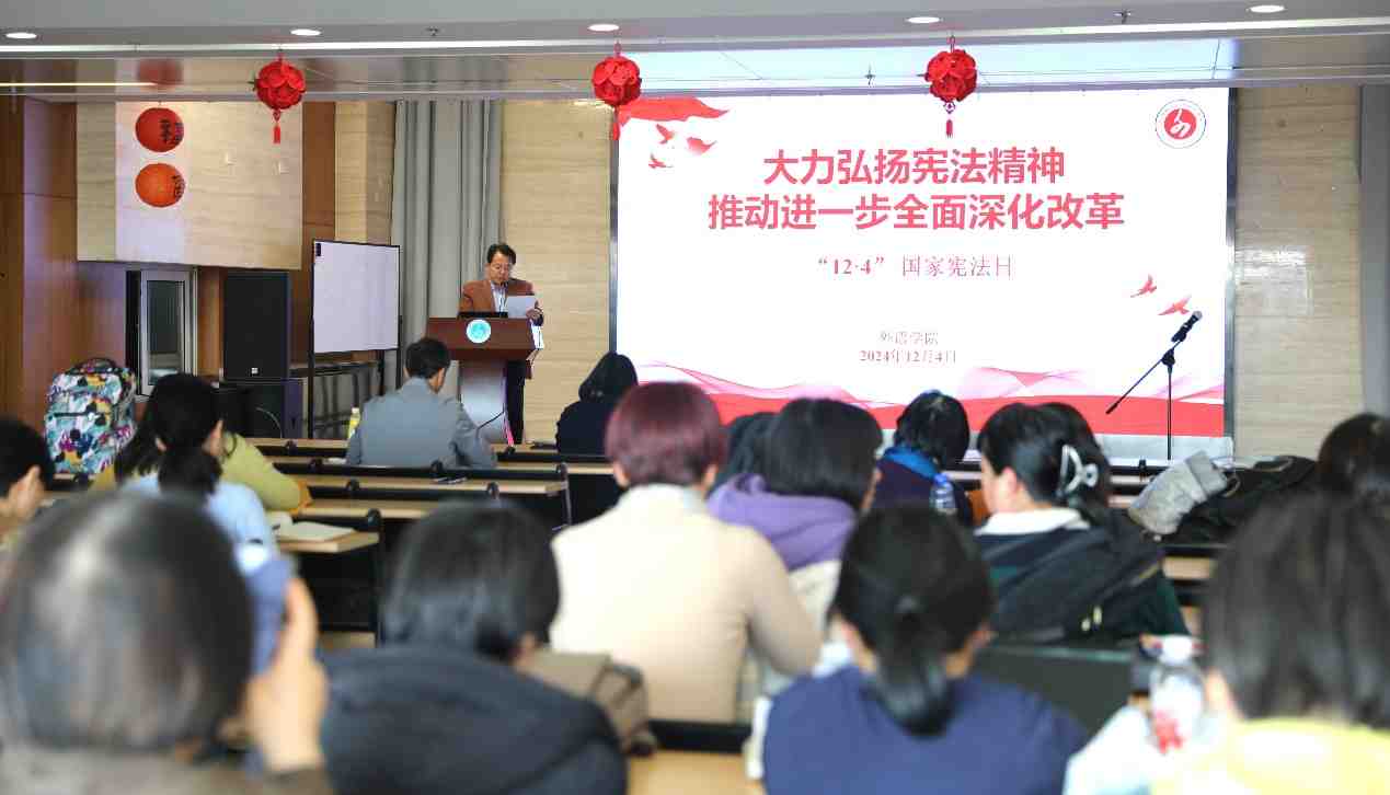 为进一步在全院教职工中弘扬宪法精神,增强宪法意识,维护宪法权威,根据校党委2024年“宪法宣传周”工作方案有关安排,外语学院于12月4日第十一个国家宪法日之际,面向全院教职工开展以“大力弘扬宪法精神 推动进一步全面深化改革”为主题的宪法宣传教育活动。
