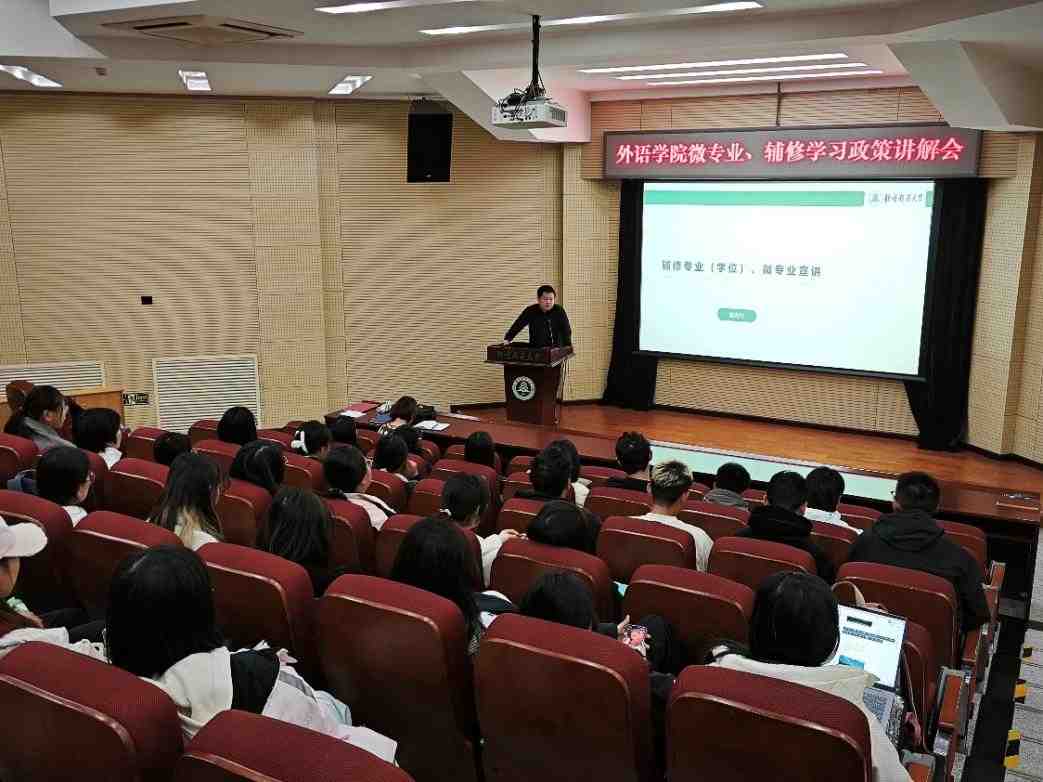 10月22日,为了提升学生的就业竞争力,为学生提供更多元化的学习选择和发展路径,外语学院在东配楼小报告厅举办微专业、辅修专业学习政策讲解会,邀请学校教务处副处长、北京高等教育学会工程训练分会理事吴健主讲。