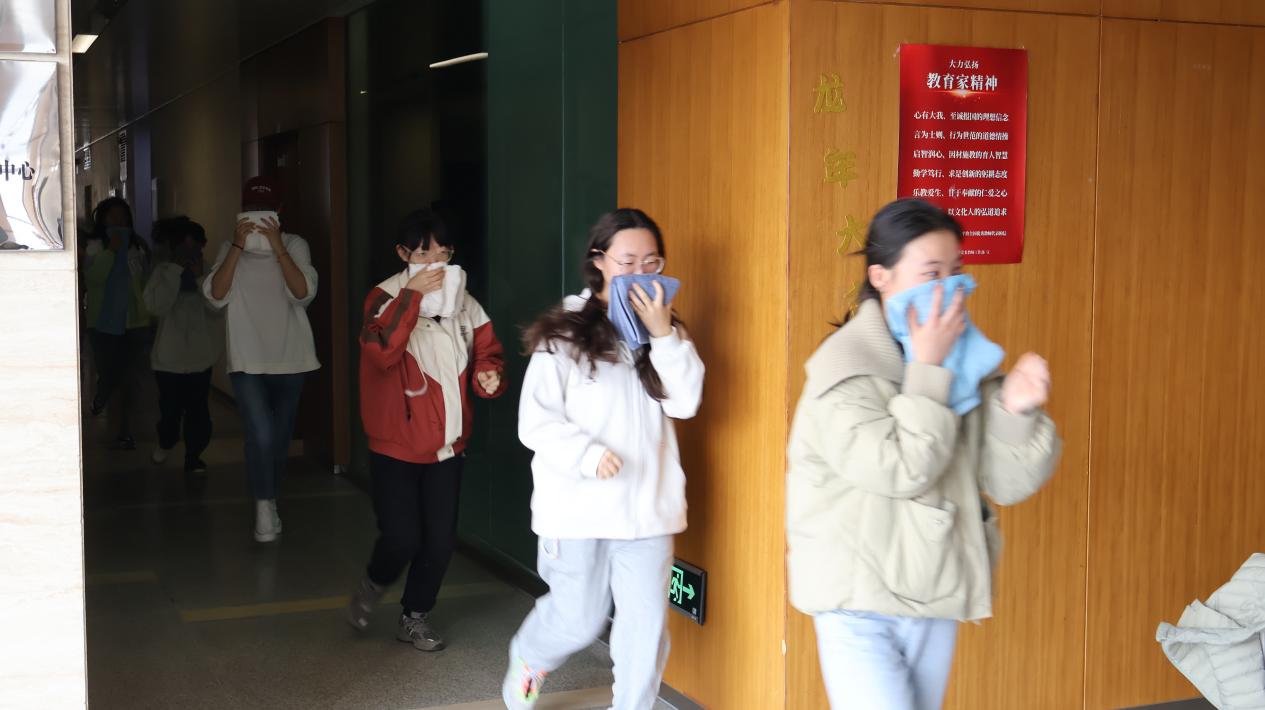 演练开始前,马俊向现场师生介绍了逃生注意事项和疏散路线。随着火情警报响起,在学院工作人员组织下,现场师生迅速用湿毛巾捂住口鼻,沿指定路线从安全通道有序撤离模拟火情区域。