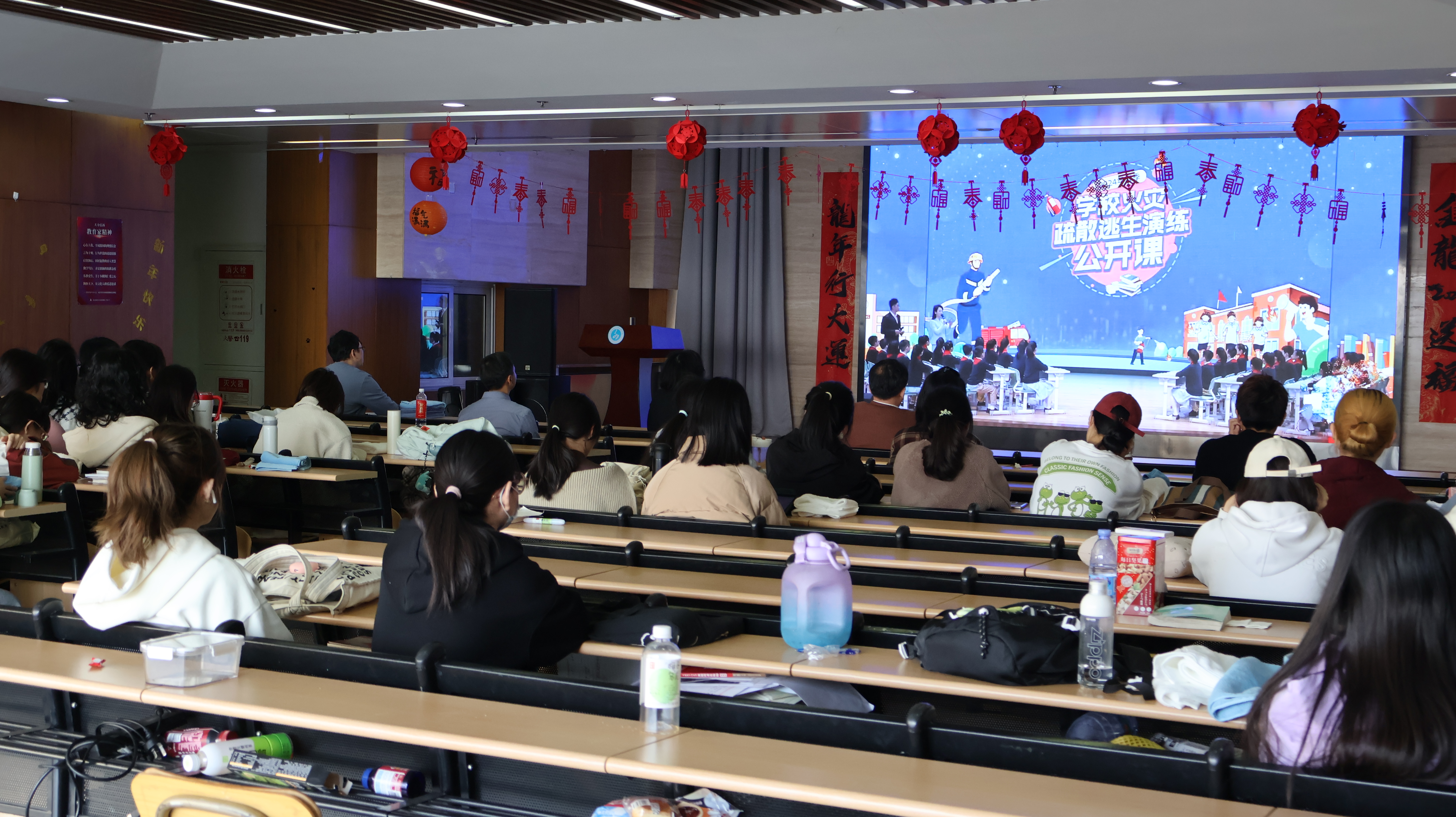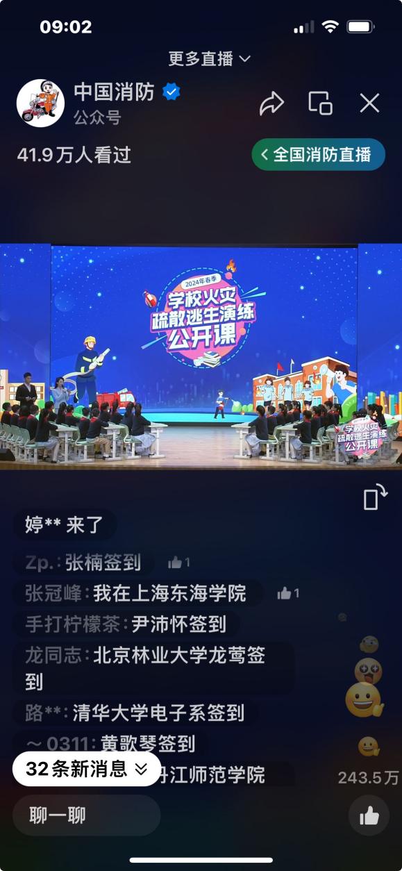 演练结束后,学院组织在场师生继续观看国家消防救援局和教育部联合举办的2024年春季学校火灾疏散逃生演练公开课。未能到场的师生也要求在线上自行观看相关直播内容。
