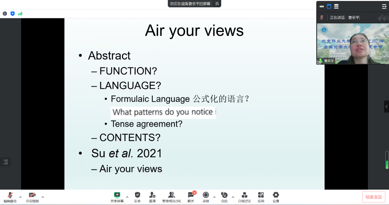 曹荣平教授带领营员们研讨了语言学学术文献,讲解了阅读文献摘要的步骤和方法,帮助营员们厘清了摘要的语步和语言特征,领略到了文献研读的方法和策略。