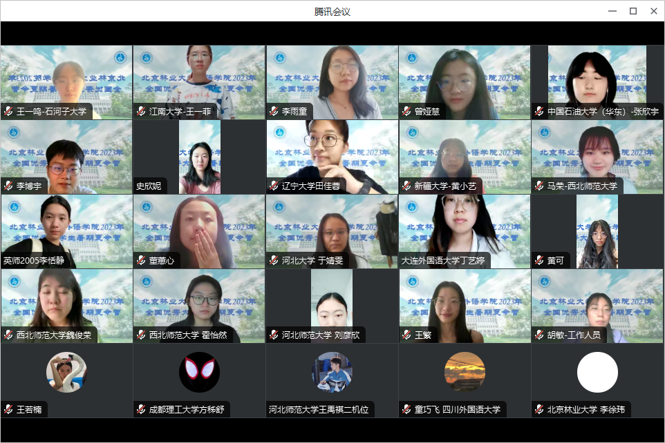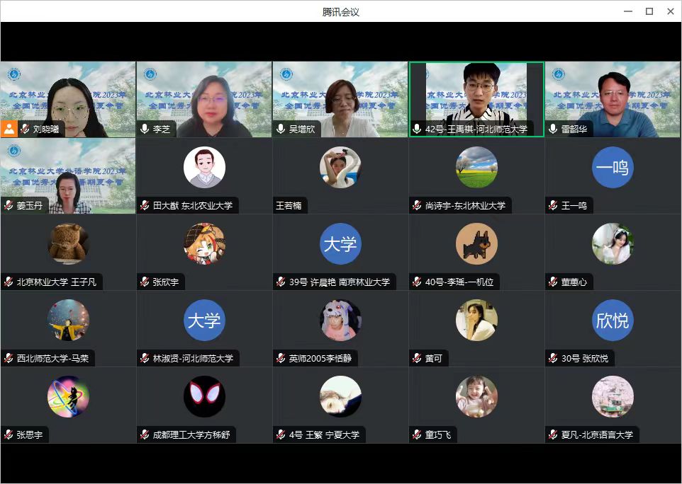 7月8-9日,外语学院线上举办2023年全国优秀大学生暑期夏令营。来自兰州大学、北京语言大学、西安外国语大学、天津外国语大学、北京化工大学、东北林业大学、云南大学、郑州大学、宁夏大学、西安电子科技大学等28所高校的44名优秀学子参加本期夏令营。