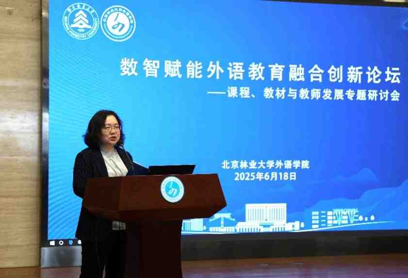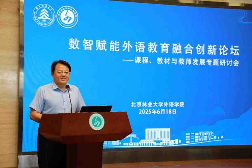 6月18日,“数智赋能外语教育融合创新论坛——课程、教材与教师发展”专题研讨会在北京林业大学外语学院举办,来自全国知名高校的专家学者出席研讨会并作主旨报告。学校教务处处长徐迎寿出席开幕式并致辞。外语学院党委书记雷韶华主持开幕式。外语学院党委副书记、院长李芝主持第一阶段主旨报告和闭幕式。外语学院科研和研究生副院长吴增欣主持第二阶段主旨报告。来自40余所兄弟高校和我院的师生参加研讨会。